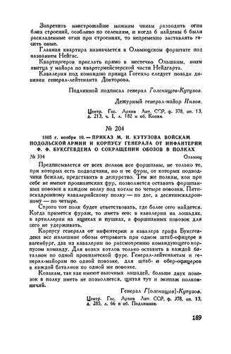 1805 г. ноября 10. — Приказ М.И. Кутузова войскам Подольской армии и корпусу генерала от инфантерии Ф.Ф. Буксгевдена о сокращении обозов в полках. Ольмюц // Центр. Гос. Архив Лит. ССР, ф. 378, оп. 13, д. 283, л. 66 и об. Подлинник.