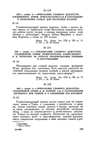 1805 г. ноября 11. — Приказание главного дежурства Соединенной армии войскам корпуса Ф.Ф. Буксгевдена о назначении солдат для постройки батарей