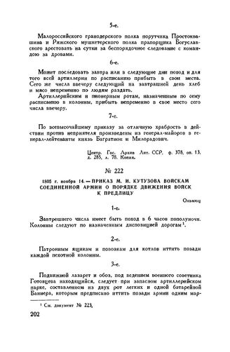 1805 г. ноября 14. — Приказ М.И. Кутузова войскам Соединенной армии о порядке движения войск к Предлицу. Ольмюц // Центр. Гос. Архив Лит. ССР, ф. 378, оп. 13, д. 283, л. 73. Копия.