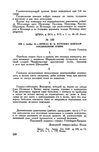 1805 г. ноября 18. — Приказ М.И. Кутузова войскам Соединенной армии. Селение Годнежиц // Центр. Гос. Архив Лит. ССР, ф. 378, оп. 13, д. 213, ч. 1, л. 199. Копия.