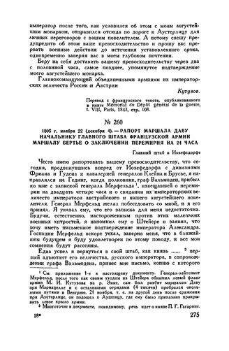 1805 г. ноября 22 (декабря 4). — Рапорт маршала Даву начальнику главного штаба французской армии маршалу Бертье о заключении перемирия на 24 часа. Главный штаб в Иозефсдорфе