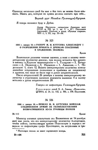 1806 г. января 16. — Приказ М.И. Кутузова войскам Соединенной армии об укомплектовании возвратившихся из-за границы полков. Броды // Центр. Гос. Архив Лит. ССР, ф. 378, оп. 13, д. 213, ч. 2, л. 1130 и об. Подлинник.