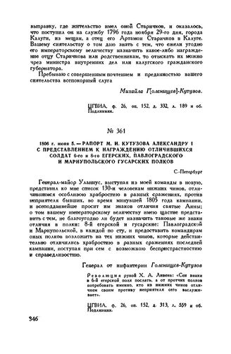 1806 г. июня 5. — Рапорт М.И. Кутузова Александру I с представлением к награждению отличившихся солдат 6-го и 8-го егерских, Павлоградского и Мариупольского гусарских полков. С.-Петербург // ЦГВИА, ф. 26, оп. 152, д. 313, л. 559 и об. Подлинник.
