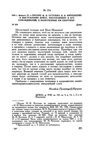 1806 г. февраля 27. — Письмо М.И. Кутузова И.И. Михельсону о выступлении войск, поступающих в его командование, в назначенные им квартиры. Дубно // ЦГВИА, ф. 9190, оп. 165, св. 5, д. 16, л. 2 и об. Подлинник.