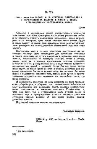 1806 г. марта 1. — Рапорт М.И. Кутузова Александру I о перемещениях полков в связи с вновь утвержденным расписанием войск. Дубно