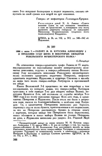 1806 г. июня 7. — Рапорт М.И. Кутузова Александру I о предании суду шефа и некоторых офицеров Ревельского мушкетерского полка. С.-Петербург