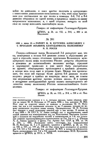 1806 г. июня 13. — Рапорт М.И. Кутузова Александру I с просьбой объявить благодарность полковнику И.П. Росси // ЦГВИА, ф. 26, оп. 152, д. 314, л. 558 и об. Подлинник.