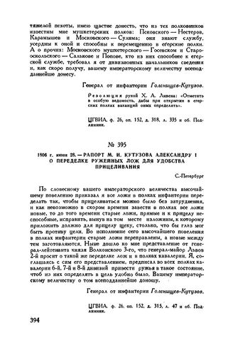 1806 г. июня 28. — Рапорт М.И. Кутузова Александру I о переделке ружейных лож для удобства прицеливания. С.-Петербург // ЦГВИА, ф. 26, оп. 152, д. 315, л. 47 и об. Подлинник.