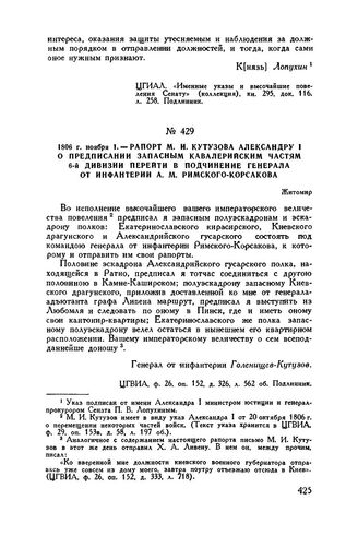1806 г. ноября 1. — Рапорт М.И. Кутузова Александру I о предписании запасным кавалерийским частям 6-й дивизии перейти в подчинение генерала от инфантерии А.М. Римского-Корсакова. Житомир