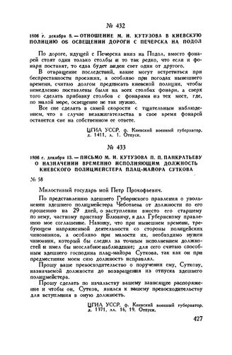 1806 г. декабря 13. — Письмо М.И. Кутузова П.П. Панкратьеву о назначении временно исполняющим должность киевского полицмейстера плац-майора Суткова