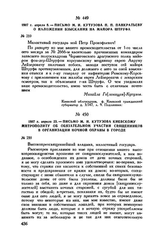 1807 г. апреля 8. — Письмо М.И. Кутузова П.П. Панкратьеву о наложении взыскания на майора Штруфа // Киевский облгосархив, ф. Киевский гражданский губернатор, д. 3/747, л. 9. Подлинник.