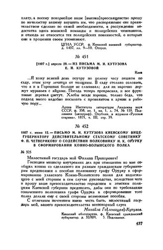 1807 г. апреля 29. — Из письма М.И. Кутузова Е.И. Кутузовой. Киев // Архив Института литературы Академии наук СССР, ф. 358, оп. 1, кн. 1, л. 74, № 159. Подлинник (автограф). Опублик. в журнале «Русская старина», 1871, т. III, стр. 59.