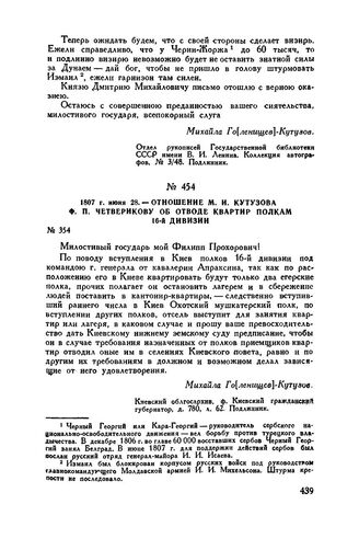 1807 г. июня 28. — Отношение М.И. Кутузова Ф.П. Четверикову об отводе квартир полкам 16-й дивизии // Киевский облгосархив, ф. Киевский гражданский губернатор, д. 780, л. 62. Подлинник.