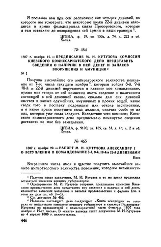 1807 г. ноября 20. — Рапорт М.И. Кутузова Александру I о вступлении в командование 8-й, 9-й, 18-й и 22-й дивизиями. Киев // ЦГВИА, ф. 26, оп. 152, д. 365, л. 398 и об. Подлинник.