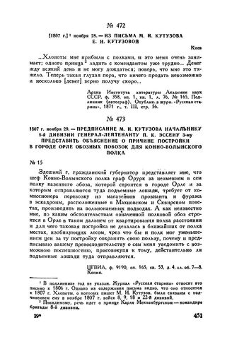 1807. г. ноября 29. — Предписание М.И. Кутузова начальнику 8-й дивизии генерал-лейтенанту П.К. Эссену 3-му представить объяснение о причине постройки в городе Орле обозных повозок для Конно-Волынского полка // ЦГВИА, ф. 9190, оп. 165, св. 53, д. 4, лл. об. 7-8. Копия.