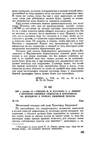 1807 г. декабря 19. — Письмо М.И. Кутузова X.А. Ливену о перемене обшивки обшлагов и воротников на мундирах в полках линейной пехоты. Киев // ЦГВИА, ф. 26, оп. 152, д. 396, л. 52. Подлинник.