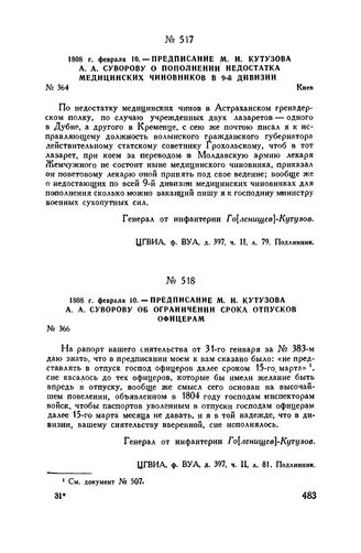 1808 г. февраля 10. — Предписание М.И. Кутузова А.А. Суворову о пополнении недостатка медицинских чиновников в 9-й дивизии. Киев // ЦГВИА, ф. ВУА, д. 397, ч. II, л. 79. Подлинник.