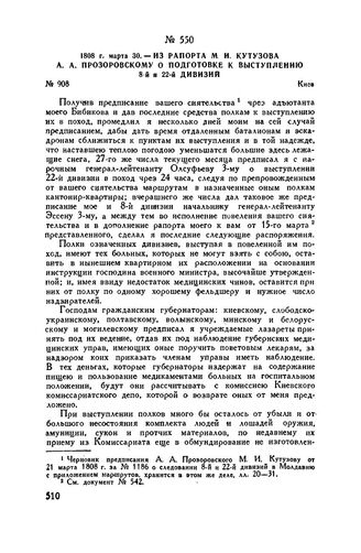 1808 г. марта 30. — Из рапорта М.И. Кутузова А.А. Прозоровскому о подготовке к выступлению 8-й и 22-й дивизий. Киев // ЦГВИА, ф. 9190, оп. 166, св. 12, д. 65, лл. 35- 39 об. Подлинник.