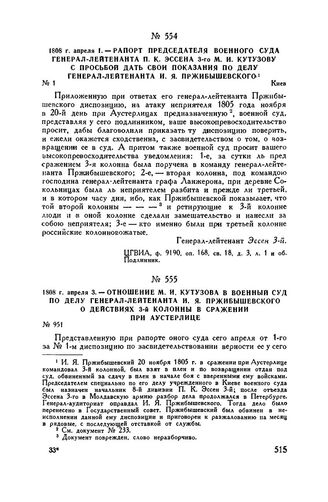 1808 г. апреля 1. — Рапорт председателя военного суда генерал-лейтенанта П.К. Эссена 3-го М.И. Кутузову с просьбой дать свои показания по делу генерал-лейтенанта И.Я. Пржибышевского. Киев // ЦГВИА, ф. 9190, оп. 168, св. 18, д. 3, л. 1 и об. Подлинник.