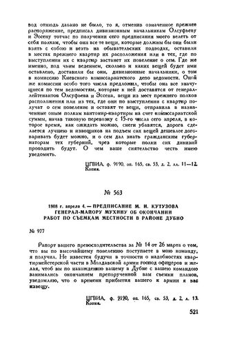 1808 г. апреля 4. — Предписание М.И. Кутузова генерал-майору Мухину об окончании работ по съемкам местности в районе Дубно // ЦГВИА, ф. 2120, оп. 165, св. 53, д. 2, л. 13. Копия.