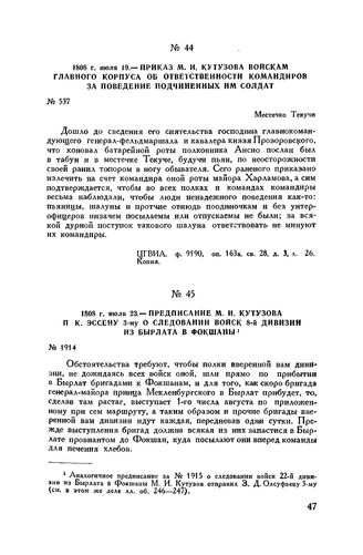 1808 г. июля 19. — Приказ М.И. Кутузова войскам главного корпуса об ответственности командиров за поведение подчиненных им солдат. Местечко Текучи
