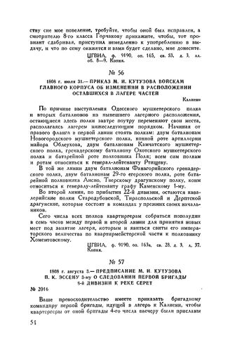 1808 г. июля 31. — Приказ М.И. Кутузова войскам главного корпуса об изменении в расположении оставшихся в лагере частей. Калиени // ЦГВИА, ф. 9190, оп. 163а, св. 28, д. 3, л. 37. Копия.