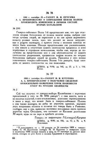 1808 г. сентября 15. — Рапорт М.И. Кутузова А.А. Прозоровскому о запрещении шефам полков производить изменения в личном составе вторых батальонов // ЦГВИА, ф. 9190. оп. 165, св. 53, д. 3, л. 116. Копия.
