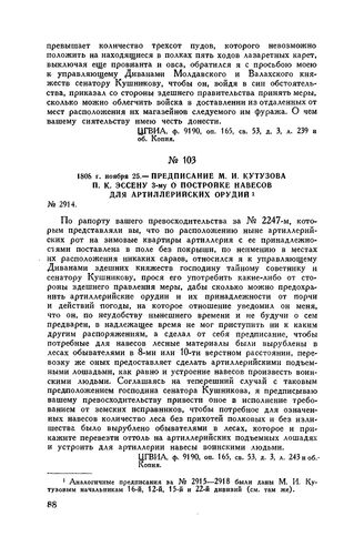 1808 г. ноября 25. — Предписание М.И. Кутузова П.К. Эссену 3-му о постройке навесов для артиллерийских орудий // ЦГВИА, ф. 9190, оп. 165, св. 53, д. 3, л. 243 и об. Копия.
