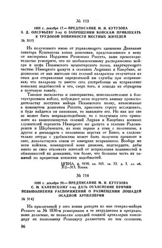 1808 г. декабря 20. — Предписание М.И. Кутузова С.М. Каменскому 1-му дать объяснение причин невыполнения распоряжений о размещении лошадей осадной артиллерии // ЦГВИА, ф. 9190, оп. 165, св. 53, д. 3, лл. об. 322-323. Копия.