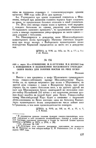 1809 г. марта 30. — Отношение М.И. Кутузова П.К. Эссену 3-му с извещением о выдвижении Московского гренадерского полка для занятия постов на реке Бузео. Фокшаны // ЦГВИА, ф. 9190, оп. 168, св. 41, д. 11, ч. 1. л. 8. Копия.
