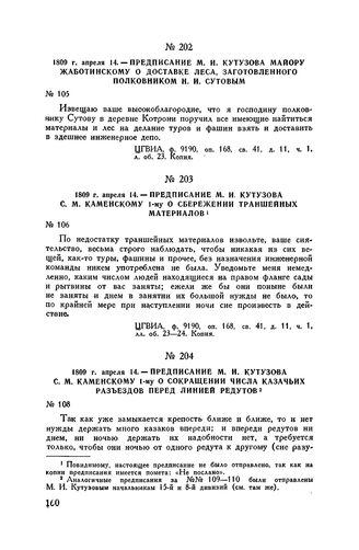 1809 г. апреля 14. — Предписание М.И. Кутузова С.М. Каменскому 1-му о сокращении числа казачьих разъездов перед линией редутов // ЦГВИА, ф. 9190, оп. 168, св. 41, д. 11, ч. 1, л. 24 и об. Копия.