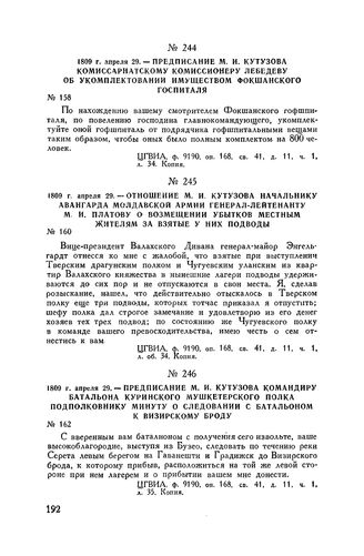 1809 г. апреля 29. — Предписание М.И. Кутузова комиссариатскому комиссионеру Лебедеву об укомплектовании имущества фокшанского госпиталя // ЦГВИА, ф. 9190, оп. 168, св. 41, д. 11, ч. 1, л. 34. Копия.