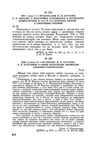 1809 г. июня 14. — Из письма М.И. Кутузова Е.И. Кутузовой о своем назначении литовским военным губернатором. Галац // Архив Института литературы Академии наук СССР, ф. 358, оп. 1, кн. 1, л. 87, № 200/209. Автограф. Опублик. в журн. «Русская старина», 1871 г., т. III, стр. 204.