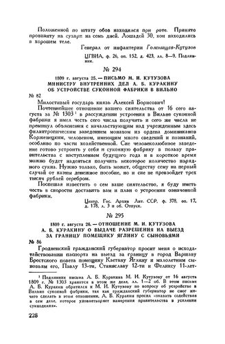 1809 г. августа 26. — Отношение М.И. Кутузова А.Б. Куракину о выдаче разрешения на выезд за границу помещику Яглину с сыновьями // Центр. Гос. Архив Лит. ССР, ф. 378, оп. 17, д. 301, л. 49 и об. Копия.