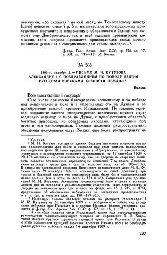 1809 г. октября 2. — Письмо М.И. Кутузова Александру I с поздравлен...