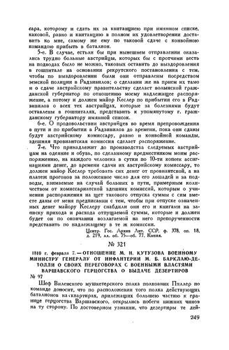 1810 г. февраля 7. — Отношение М.И. Кутузова военному министру генералу от инфантерии М.Б. Барклаю-де-Толли о своих переговорах с военными властями Варшавского герцогства о выдаче дезертиров // ЦГВИА, ф. ВУА, д. 417, лл. 17-18. Подлинник. Опублик. в сб. «Отечественная война 1812 года. Материалы Военно-ученого архива Главного штаба», отд. 1, т. 1, ч. II, СПБ, 1900, стр. 24-25.