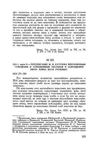 1810 г. марта 6. — Предписание М.И. Кутузова пограничным таможням и таможенным заставам о запрещении ввоза хлеба из-за границы // Центр. Гос. Архив Лит. ССР, ф. 378, оп. 18, д. 226, л. об. 130. Копия.