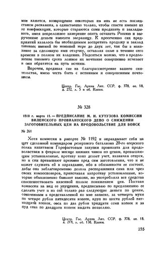 1810 г. марта 11. — Предписание М.И. Кутузова комиссии Виленского провиантского депо о снижении заготовительных цен на продовольствие для войск // Центр. Гос. Архив Лит. ССР, ф. 378, оп. 18, д. 219, л. об. 138. Копия.