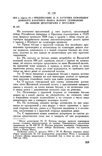 1810 г. апреля 23. — Предписание М.И. Кутузова командиру Донского казачьего полка майору Селиванову об обмене дезертирами с Пруссией // Центр. Гос. Архив Лит. ССР, ф. 378, оп. 18, д. 219, лл. 199-201. Копия.