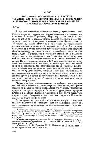 1810 г. июня 12. — Отношение М.И. Кутузова товарищу министра внутренних дел О.П. Козодавлеву с запросом о проведении конфискации имений лиц, уехавших самовольно за границу