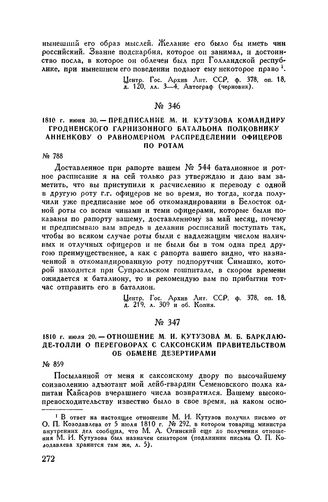 1810 г. июня 30. — Предписание М.И. Кутузова командиру Гродненского гарнизонного батальона полковнику Анненкову о равномерном распределении офицеров по ротам // Центр. Гос. Архив Лит. ССР, ф. 378, оп. 18, д. 219, л. 309 и об. Копия.