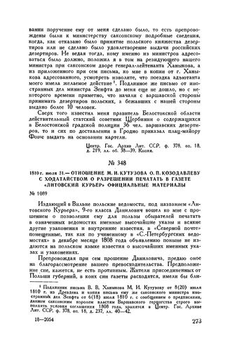 1810 г. июля 31. — Отношение М.И. Кутузова О.П. Козодавлеву с ходатайством о разрешении печатать в газете «Литовский курьер» официальные материалы // Центр. Гос. Архив Лит. ССР, ф. 378, оп. 18, д. 266, лл. об. 348-об. 349. Копия.