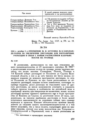 1810 г. октября 5. — Отношение М.И. Кутузова М.Б. Барклаю-де-Толли об увеличении дистанции для пограничных разъездов в связи с новым расписанием казачьих постов на границе