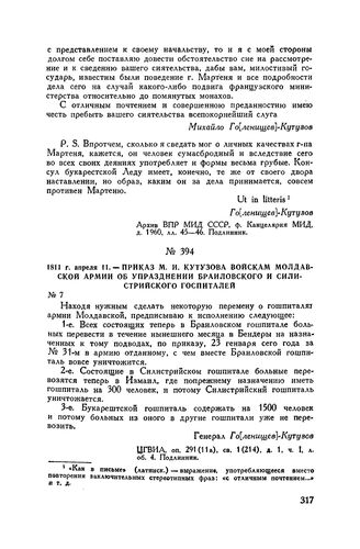 1811 г. апреля 11. — Приказ М.И. Кутузова войскам Молдавской армии об упразднении Браиловского и Силистрийского госпиталей