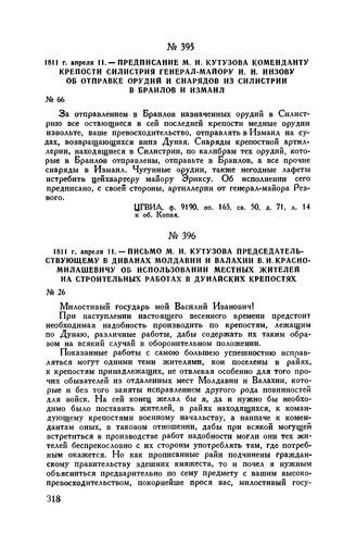 1811 г. апреля 11. — Предписание М.И. Кутузова коменданту крепости Силистрия генерал-майору И.Н. Инзову об отправке орудий и снарядов из Силистрии в Браилов и Измаил // ЦГВИА, ф. 9190, оп. 165, св. 50, д. 71, л. 14 и об. Копия.
