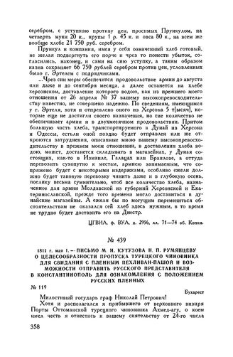 1811 г. мая 1. — Письмо М.И. Кутузова Н.П. Румянцеву о целесообразности пропуска турецкого чиновника для свидания с пленным Пехливан-пашой и возможности отправить русского представителя в Константинополь для ознакомления с положением русских пленных. Бухарест // Архив ВПР МИД СССР, ф. Канцелярия МИД, д. 1960, лл. 91-92. Подлинник.