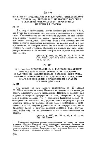 1811 г. мая 2. — Предписание М.И. Кутузова командиру корпуса генерал-лейтенанту А.Ф. Ланжерону о запрещении командировать в Москву адъютанта Вятского пехотного полка для закупки войскового снаряжения в связи с предстоящим началом военных действий // ЦГВИА, ф. 9190, оп. 165, св. 49, д. 62, лл. об. 126-127. Копия.