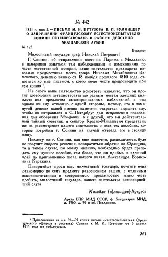 1811 г. мая 2. — Письмо М.И. Кутузова Н.П. Румянцеву о запрещении французскому естествоиспытателю Сонини путешествовать в районе действий Молдавской армии. Бухарест