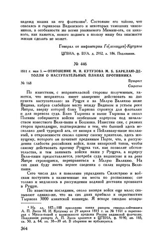 1811 г. мая 3. — Отношение М.И. Кутузова М.Б. Барклаю-де-Толли о наступательных планах противника. Бухарест // ЦГВИА, ф. ВУА, д. 2952, л. 189 и об. Подлинник.