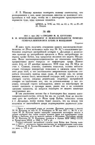 1811 г. мая [30]. — Письмо М.И. Кутузова В.И. Красно-Милашевичу о нежелательности приезда генерал-лейтенанта Бубна в Молдавию // Архив ВПР МИД СССР, ф. Канцелярия МИД, д. 1960, л. 159 и об. Копия.